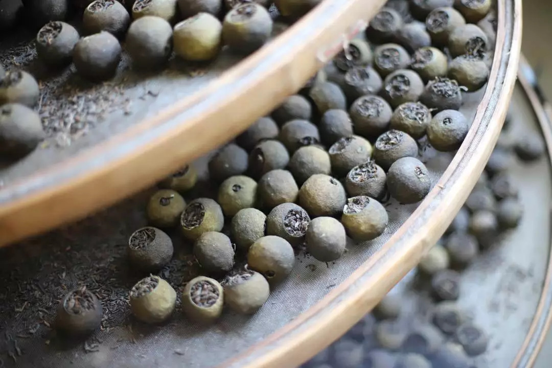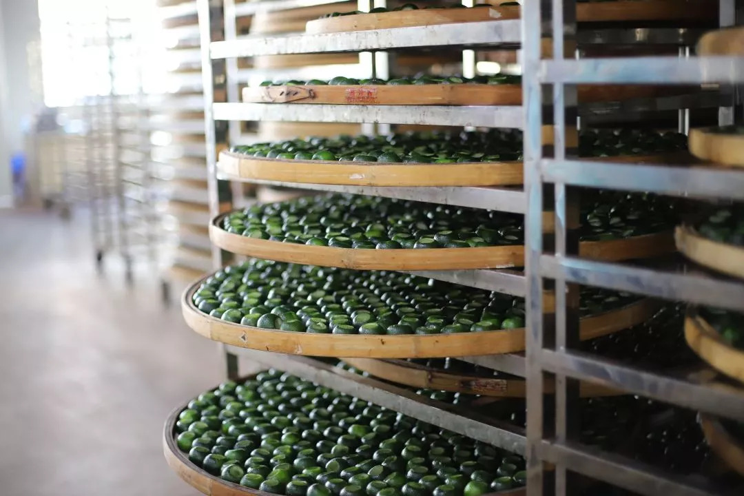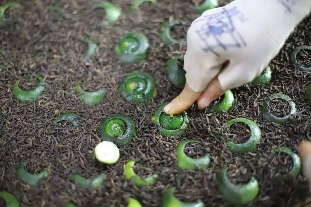 而想要成就一颗高品质的小青柑,青柑还需要经历洗果、挖果、生晒、填茶、杀青、包装等多道繁复的制作工序。