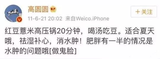高圆圆就是其中一位,她说:肥胖有一半的原因是水肿问题,积极建议大家煮红豆薏米喝,特别适合夏天祛湿消水肿。