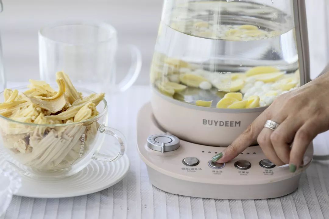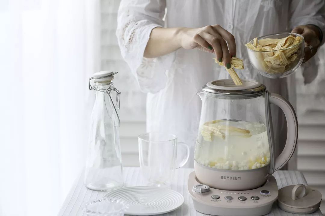3.启动养生汤模式30分钟后,将腐竹放入壶内.