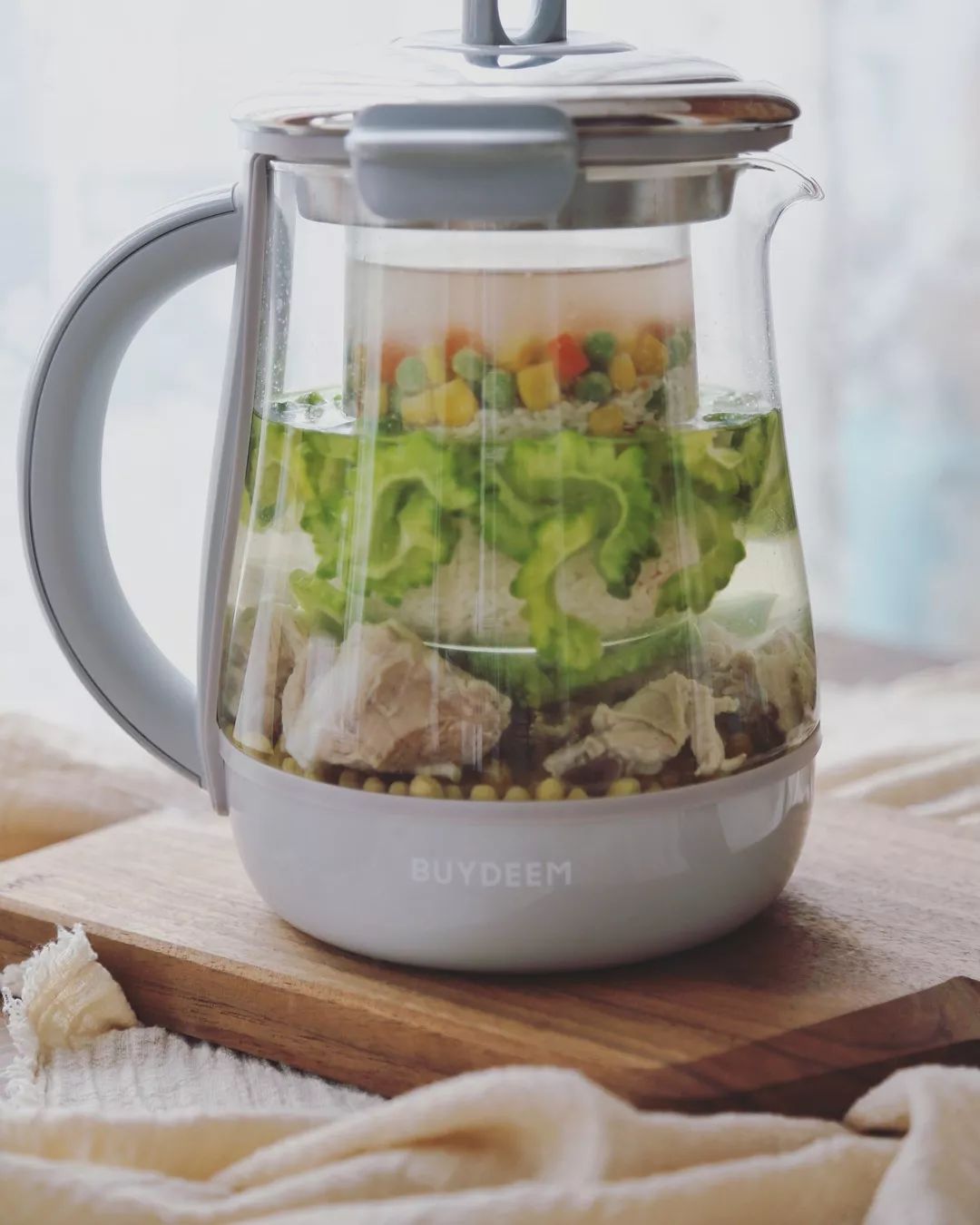 3.把打好的豆浆放入炖盅,按下北鼎养生壶,煮制30分钟后即可。