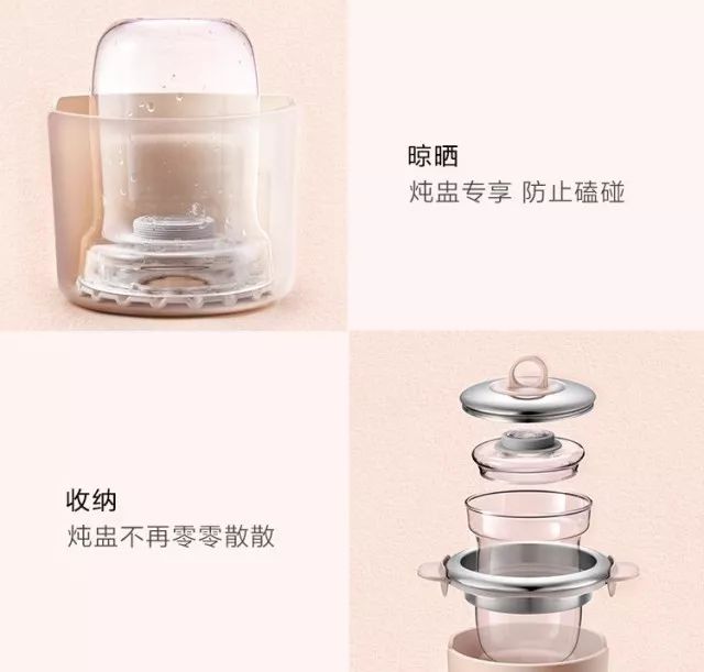 首次使用的炖盅收纳架,同样采用超粉嫩的颜色,中间印有BUYDEEM Logo,集收纳和晾晒功能于一身,炖盅置入后又放心又整齐,可以说是拯救强迫症的发明了!