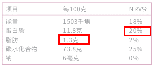 小北家椰香西米喳咋,通过国家食品的低脂肪高蛋白标准。脂肪含量仅1.3g,远远低于3g/100g的标准。蛋白质含量,每100g超过人体建议日摄入量20%。国家食品营养标签通则如下↓