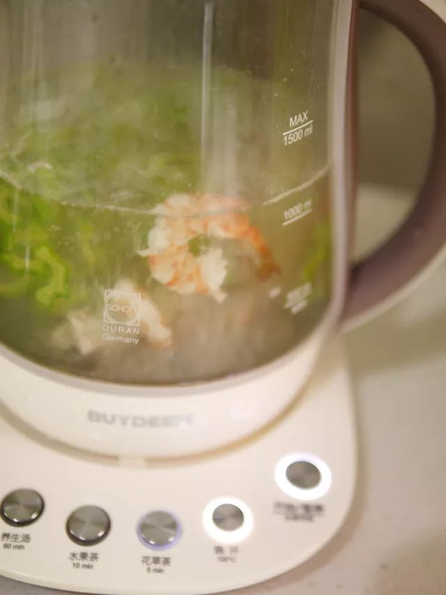 3.养生壶中倒入开水,水中加两滴油,水开后放入苦瓜,虾仁焯烫2分钟,捞出沥干水分过凉开水。