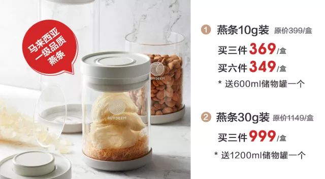 燕条10g装,买3盒每盒享优惠价;买6盒,每盒优惠价,相当于直降了将近300元,还加赠600ml储物罐1个!