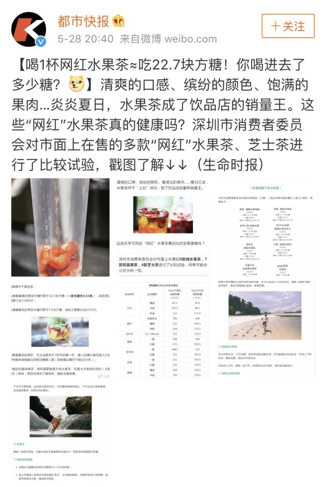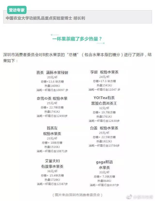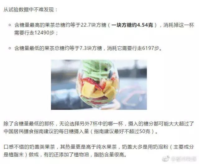 含糖量最多的水果茶,居然有103g的糖(含水果本身的糖分),要想消耗掉这一杯需要走12490步!这不是为难我们微信步数天天垫底的上班族吗!