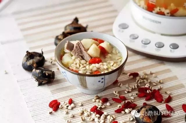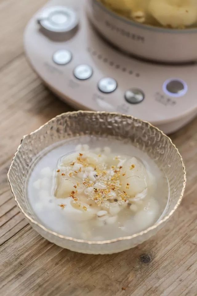 雪梨、薏米、马蹄、冰糖一起放入养生壶,加1200ml水,启动养生汤模式