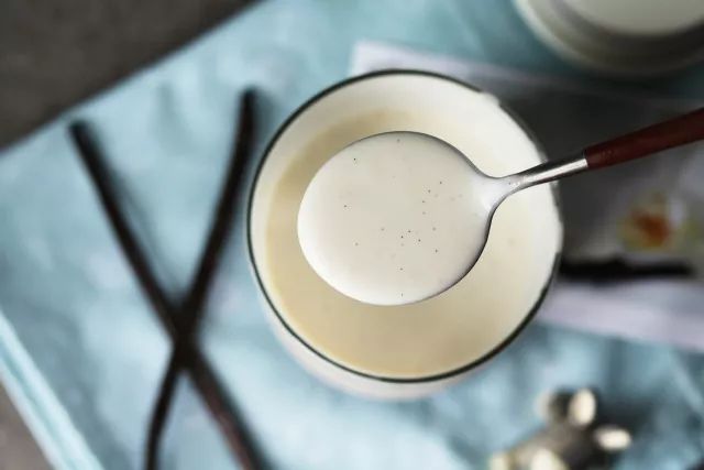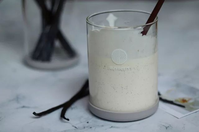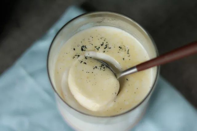 刚做好还没冷藏的时候我就被这个香气所诱惑到了,闻起来就是冰淇淋味呀。忍不住挖了一勺品尝,一勺一勺,半杯下去了...吃前记得要搅一搅哦,把底部的香草籽搅匀。