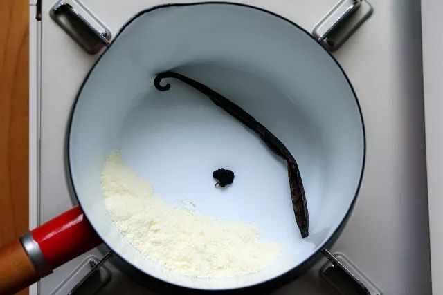 3. 香草荚对剖取籽,连皮一同放入奶锅,奶粉也加进去。