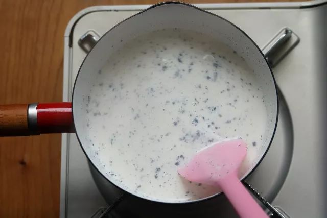 4. 倒入一升的牛奶搅拌均匀后开火煮出香草的香味。