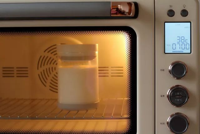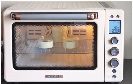 旋转烤箱上的功能旋钮选择“发酵 II” 模式,40℃很适合酸奶发酵菌生长。天气变热了,一起用烤箱做酸奶吧!