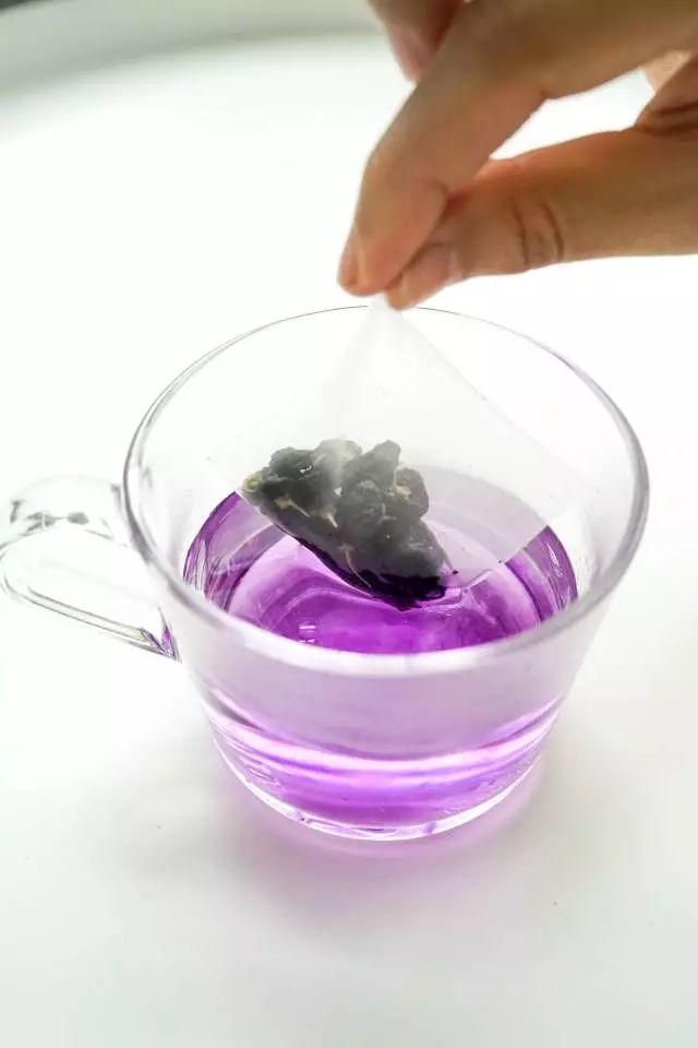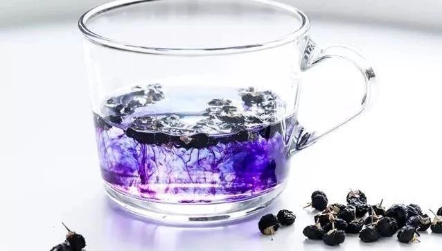 3.黑枸杞冲泡后,弥漫着浓浓的蓝色或者紫色,是富含极高的花青素的缘故。等待5分钟左右即可饮用,直到把水喝清,再把黑枸杞吃掉。