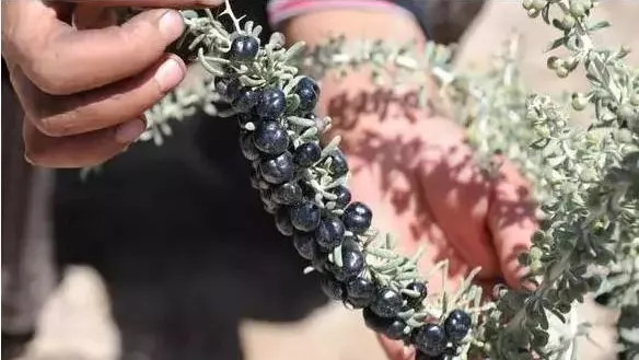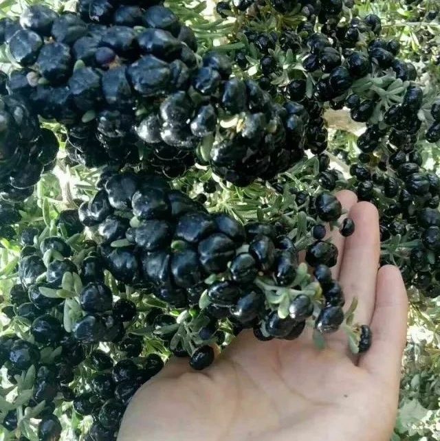 每一个训练有素的采摘工,每天能够采集的黑枸杞鲜果不足2公斤。野生黑枸杞在戈壁滩中自然生长,分布非常不均匀,跋山涉水才能觅迹采摘。
