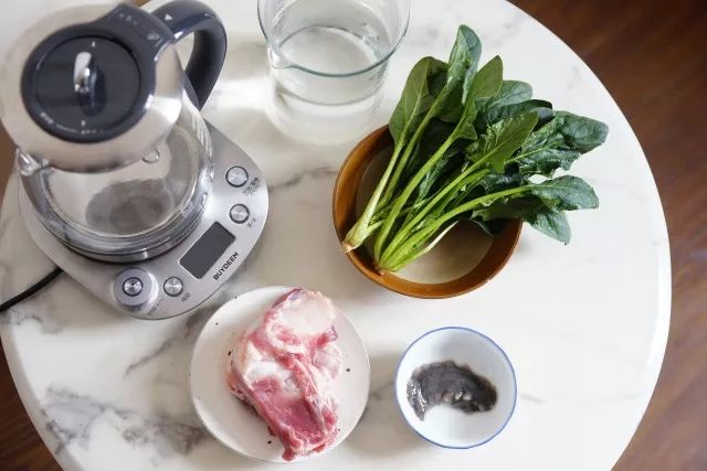 1.猪骨洗干净,焯烫一下,菠菜择洗干净。