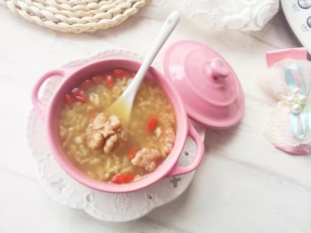 粳米50g、枸杞子10g、核桃20g、冰糖适量