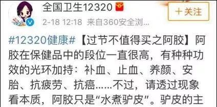 春节期间,全国12320卫生公益热线官方微博一则标题为“过年不值得买之阿胶”的微博引发热议。