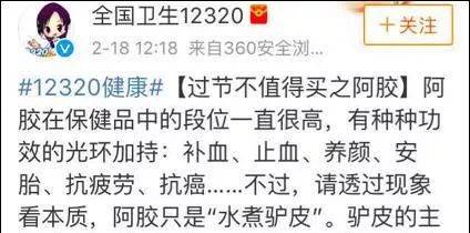 春节期间,国家卫生计生委(原卫生部)的官方微博:全国12320卫生公益热线发布了一则标题为“过年不值得买之阿胶”的微博。
