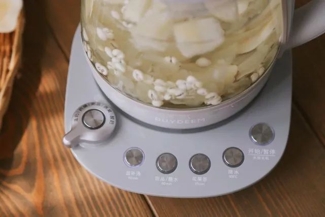 2.雪梨洗净切块或片,将所有食材放入养生壶中,加水至1000ml,选择养生汤模式。