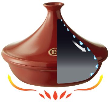因为塔吉锅内的原材料产生水蒸气,最后都会沿着盖壁循环回到锅底,而不是滴在食物上,起到小火微炖的效果。