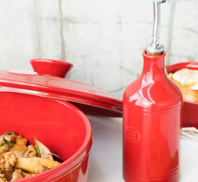 跟锅具一样,油壶也是使用法国陶土制成,表面采用特殊的钢化釉面,因此不易产生刮花和挂痕。