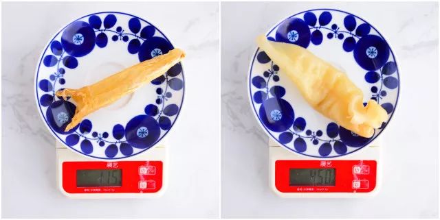 泡发率三倍以上,泡发后花胶筒身依旧纹理清晰。