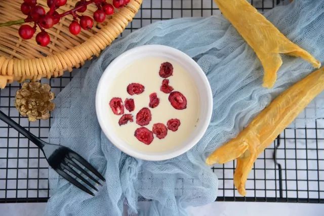 平时做了花胶炖奶,将花胶等食材吃掉后,在余下的牛奶里撒少许蔓越莓干,室温或冷藏数小时后,便凝固成一碗白如凝脂的花胶奶冻啦。