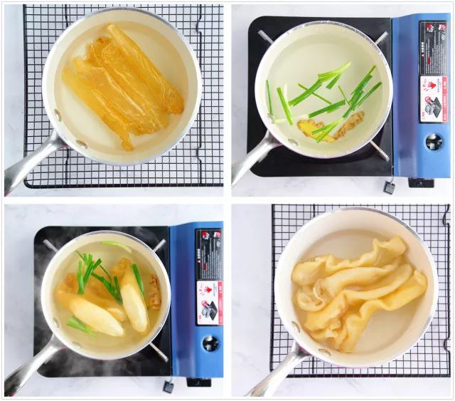 Step 3:将泡发好清洗干净的花胶放入姜葱水中煮2-3分钟。
