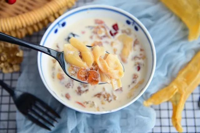 馥郁的奶香与花胶的柔嫩相得益彰,美容养颜,补血活血,更是一盏美味的滋补甜品。整碗胶原蛋白下肚,感觉自己瞬间从粗糙的女汉纸变成水灵灵的女孩纸了。