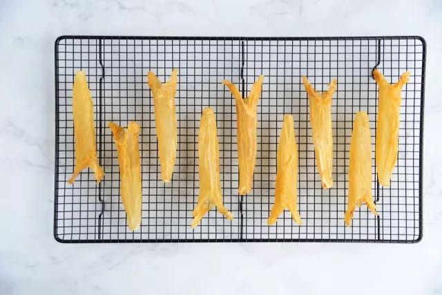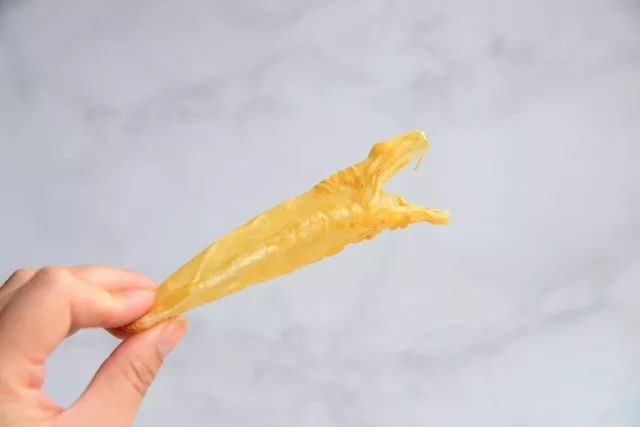 好的花胶需要满足“胶透、纹清、肉厚、肉糯”的特质,也要观察泡发率及出胶率。小北家这款花胶筒质地结实、形态完整;在阳光下呈现半透明的淡黄光泽,洁净无杂质,血筋淤血少,自然纹理清晰可见。