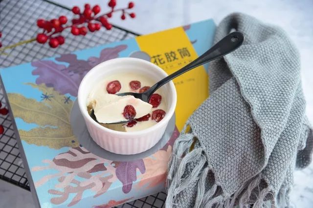 平时做了花胶炖奶,将花胶等食材吃掉后,在余下的牛奶里撒少许蔓越莓干,室温或冷藏数小时后,便凝固成一碗白如凝脂的花胶奶冻啦。