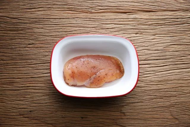 2.鸡胸用刀背拍平,提前用盐和黑胡椒腌制。