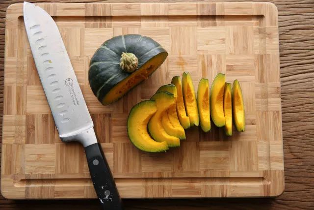 4.贝贝南瓜洗干净外皮,切成月牙状。