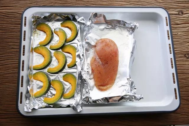 5.排好,表面撒上盐和黑胡椒.腌制好的鸡胸放在刷好油的锡纸上,放至烤盘中间,烤的时候将鸡胸肉包好。