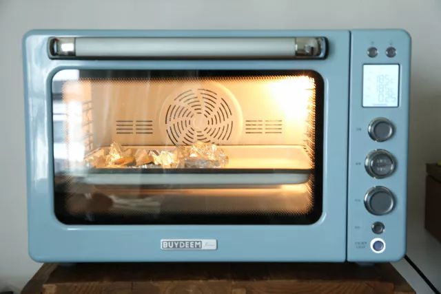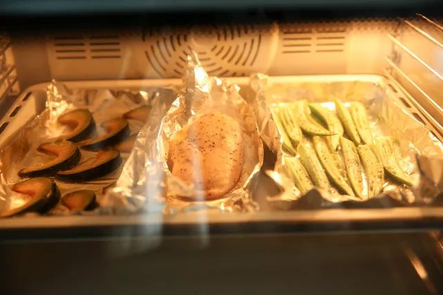 8.烤箱提示最后9分钟时候将秋葵连同锡纸放入烤盘右侧,三种食材一同出炉,最后将食材排入盘中。