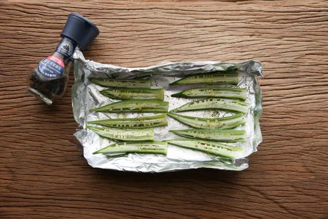 7.秋葵洗干净,斜切一分为二,表面撒盐和黑胡椒。
