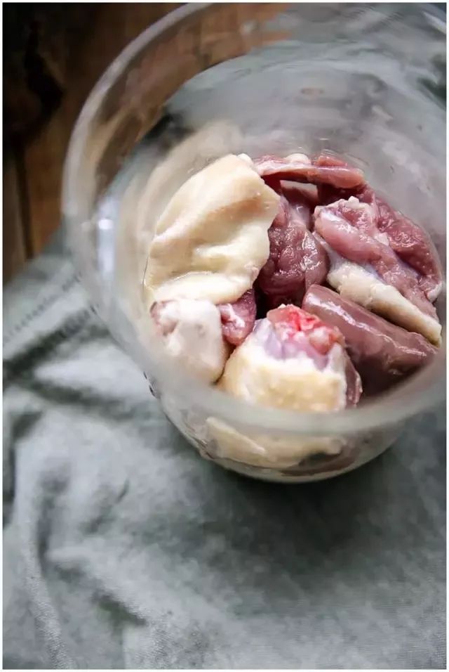 3.鸭肉先放进炖盅。随后放入松茸、姜片和葱段,并加入料酒。