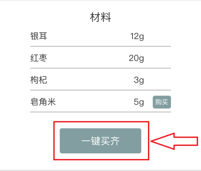 点进食谱页,你会发现有些食谱的材料旁边写着「一键买齐」,这说明这些材料小北家有的卖哦!