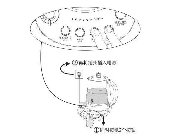 3.同时按住“花果茶”和“烧水”按键,按稳后再将电源插头插入电源,听到机器短鸣一声后,方可松开手指。