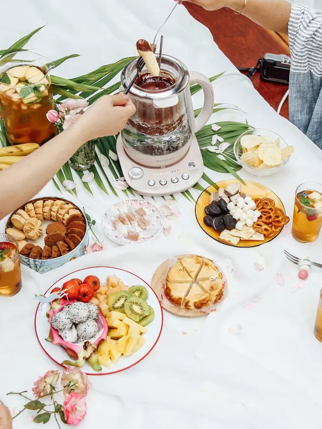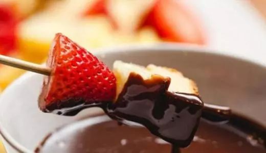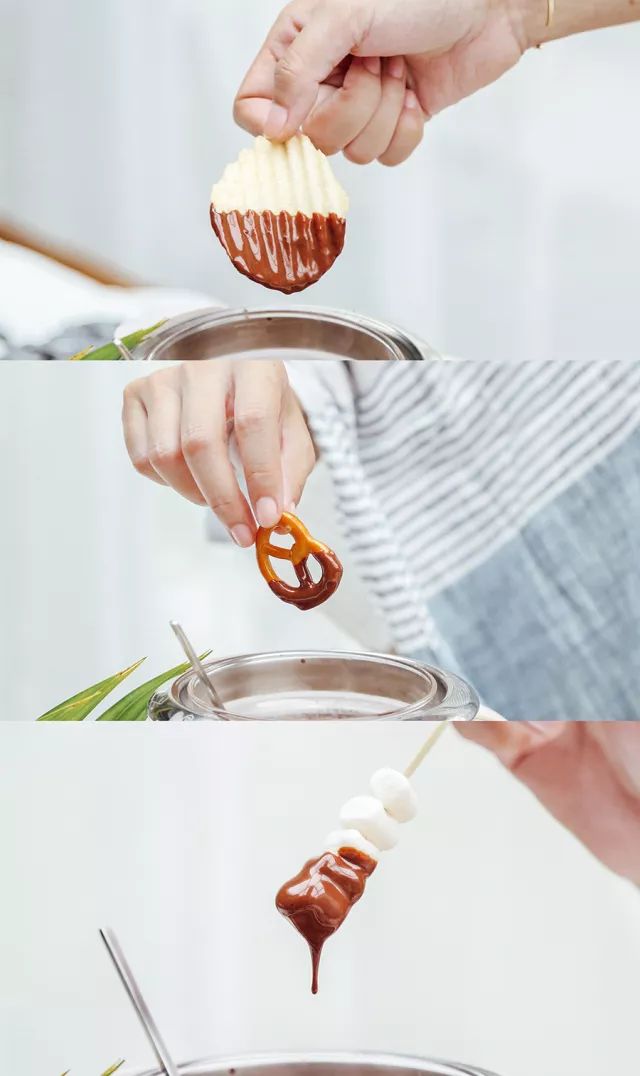 2. 可以自行选择搭配巧克力火锅的食材,水果、蛋糕、吐司丁、棉花糖、饼干都可以。记得巧克力煮好之前一定要处理好,因为煮好之后会慢慢变浓稠,一定要趁早吃。