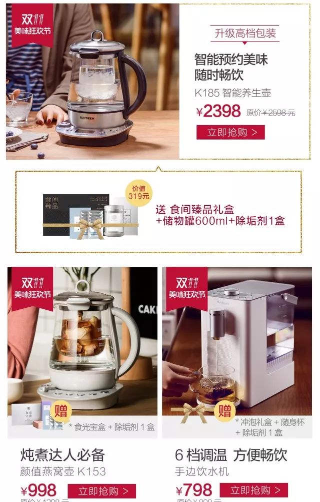 11.7-11.11在小北家购买电器类产品,当然不止养生壶,买饮水机电水壶也同样有好礼相送,送完即止,所以下手一定要快!另外购电器,还有积分送哦,攒积分秒秒钟再换一个壶!
