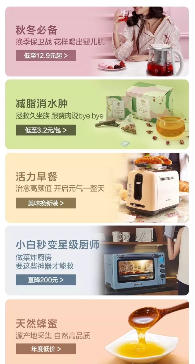 各种类型的电器和料包,小北已经帮你提前归好类啦,主会场开通后,直接戳进去选,不费脑!