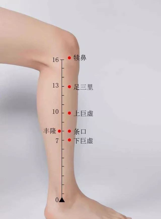 位置:足阳明胃经络穴,位于小腿前外侧、外踝尖上8寸,距胫骨前缘二横指。