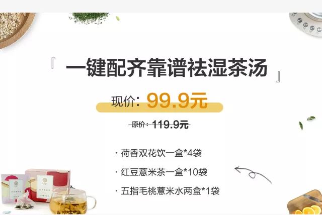 小北贴心的为你搭配好了一周祛湿套餐,内含新品红豆薏米茶一盒*10袋,荷香双花饮一盒*4份,和五指毛桃薏米水两盒*一份,套餐组合优惠价99.9元!抢完即止!
