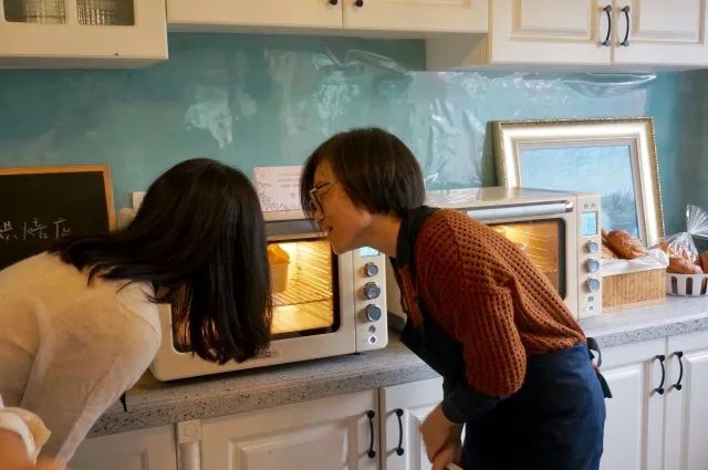 当戚风蛋糕糊送入烤箱的一刻,大家都很激动,纷纷围着烤箱观察和拍照,期待着自己的第一个作品诞生。