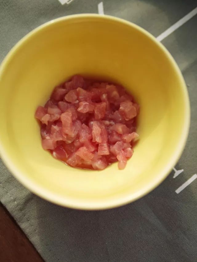 3.切碎的瘦肉丁放入碗中,加入1/4茶匙盐,一茶匙抓匀后腌制20分钟去腥;