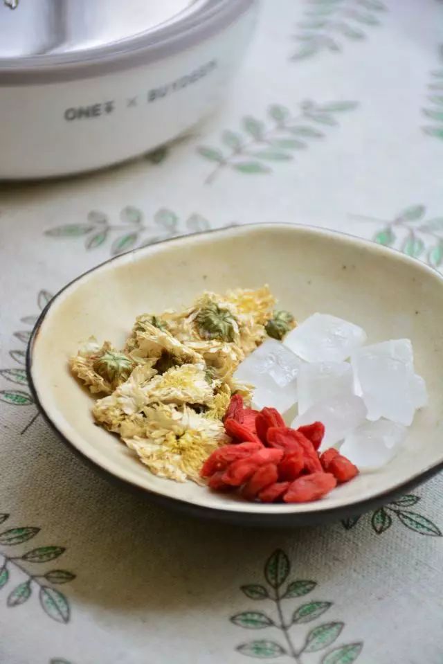 1.贡菊、枸杞用清水浸泡五分钟后,把水沥干;