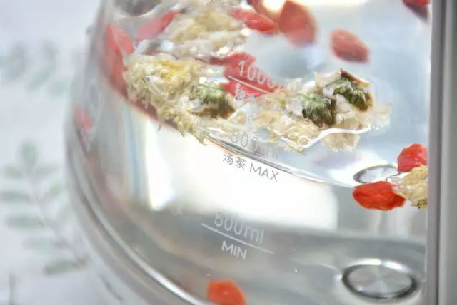 小贴士:贡菊和枸杞可以放在茶篮内操作。首次烹煮后留下200ml,可以再加600ml清水煮第二壶。