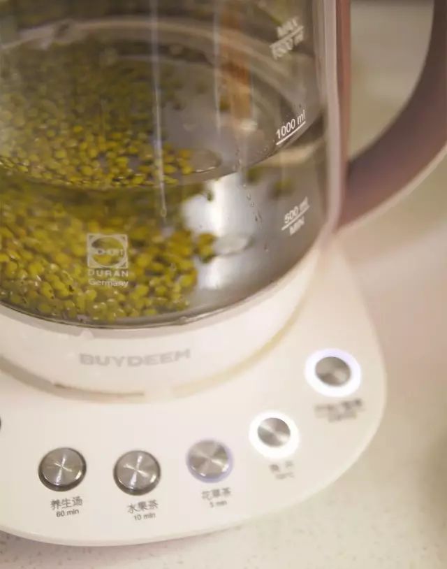3.绿豆和1000ml纯净水放入养生壶,启动烧开模式;