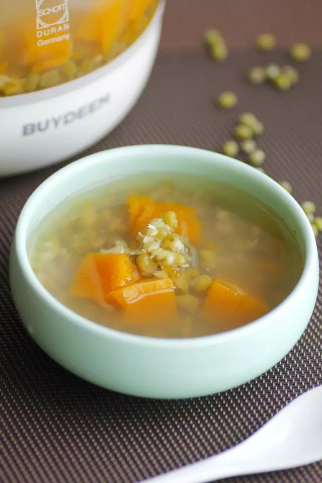 绿豆甘寒,南瓜性温,二者搭配,以南瓜的温和来缓和绿豆的寒凉,不仅可以消暑解毒,还能温补脾胃。