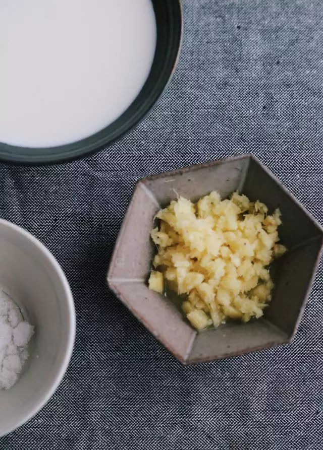 3.新鲜的老姜最好,姜汁一定要现榨,它是牛奶凝结的关键,放少了,牛奶凝结不了,放多了则太过辛辣。