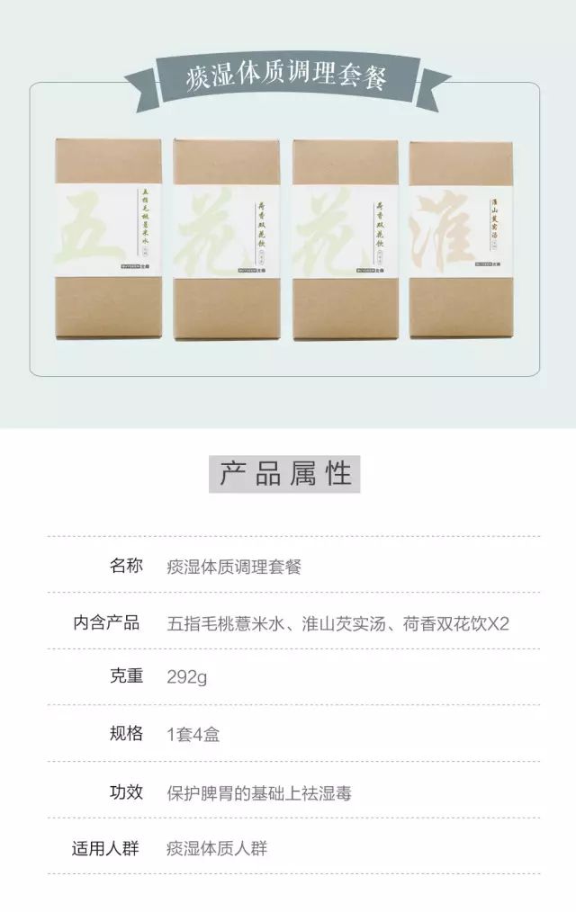 但是你们还有小北,小北选取了五指毛桃、山药、薏米、芡实这些健脾利湿、化淤祛痰的食材,组成了针对痰湿体质的套餐。